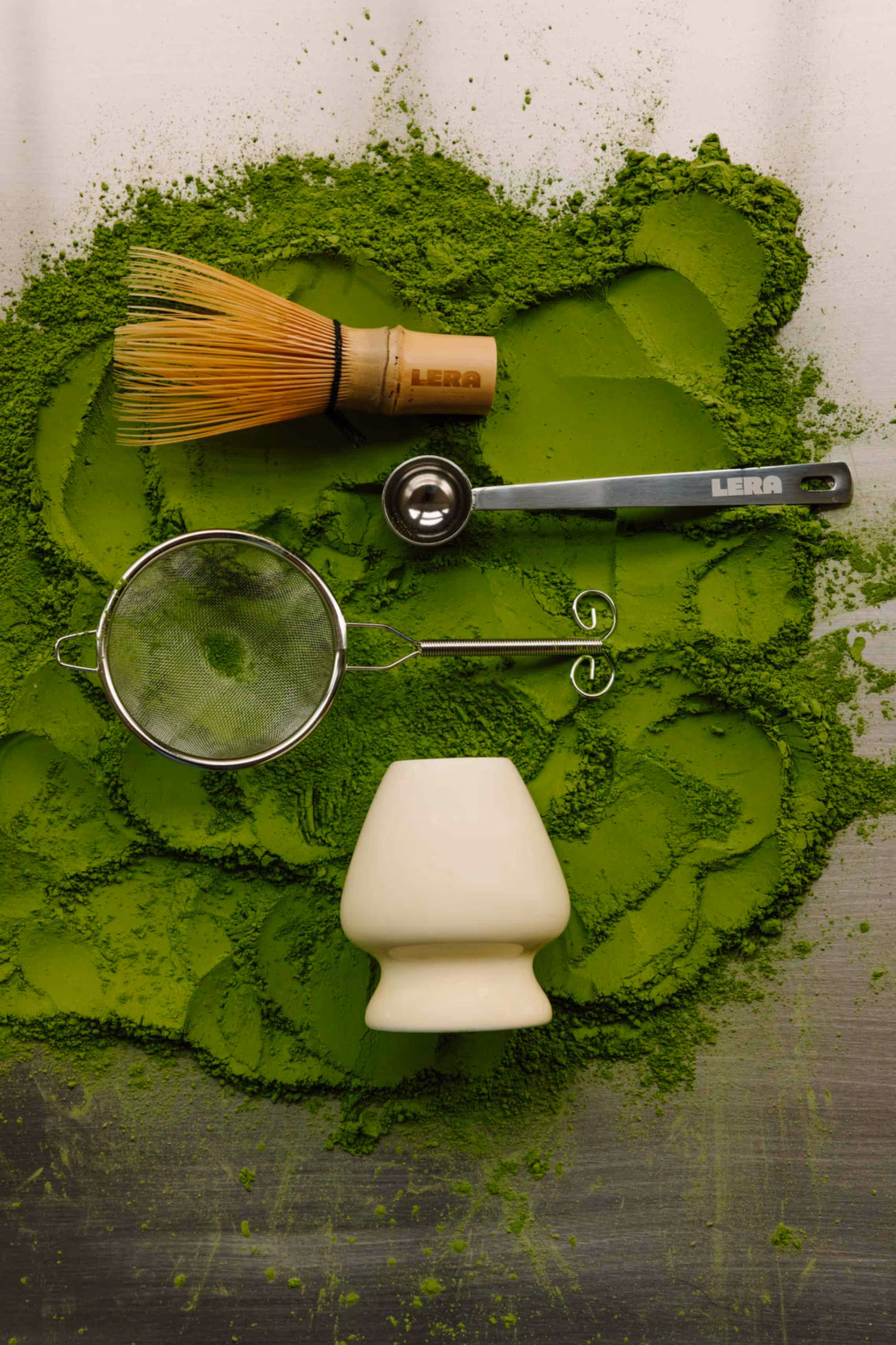 Sift LERA matcha into a bowl. Add hot water and whisk until smooth and frothy. Fill a glass with ice, pour in the cold milk, and finish with the vivid green layer of matcha. Stir gently before drinking — the colour softens, the flavour stays bright.