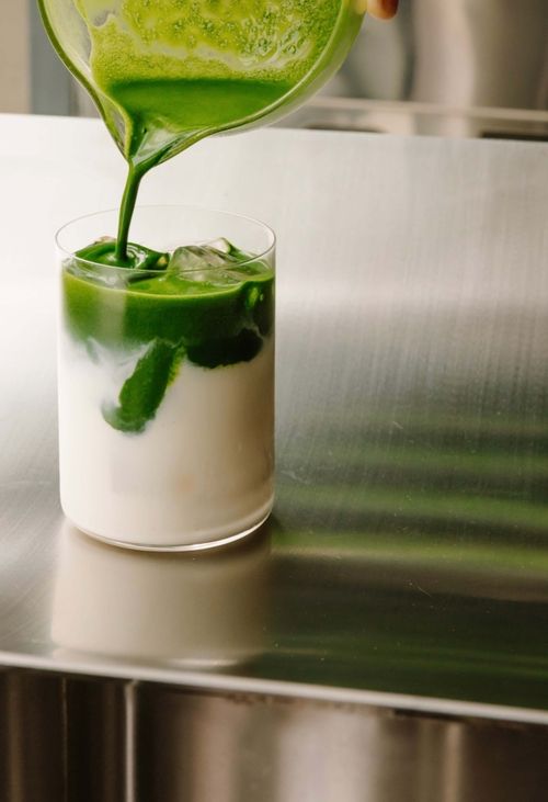 Sift LERA matcha into a bowl. Add hot water and whisk until smooth and frothy. Fill a glass with ice, pour in the cold milk, and finish with the vivid green layer of matcha. Stir gently before drinking — the colour softens, the flavour stays bright.
